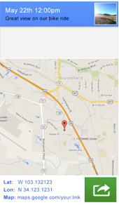 DropGeo is the easiest way to save your single point location data. You can save your current location with one click. You can also add notes or a photo to each locations. Share your current or past saved locations and photos at any time over email, text or social networks such as Facebook. People can easily find the location you are sending or posting by following the link to Google maps. Here they can get directions to your location or view other relevant information in Google maps. |